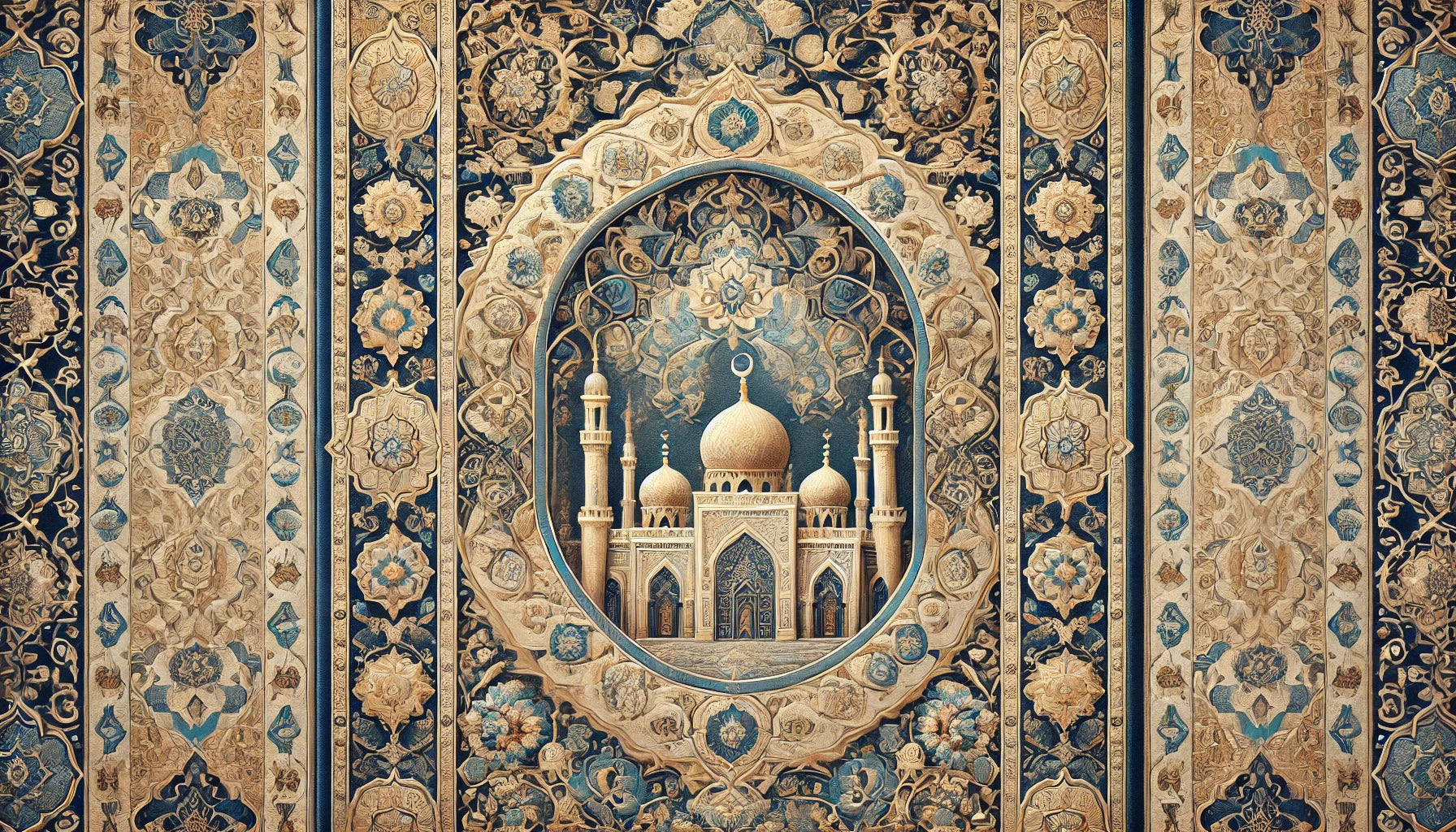 "Un chef-d'œuvre d'élégance et de spiritualité : l'architecture et l'art islamique s'entrelacent dans une harmonie dorée et bleutée."